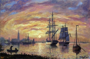 2018Olieverfschilderij op doek van een kleine haven met boten, naar J.B. Jongkind.